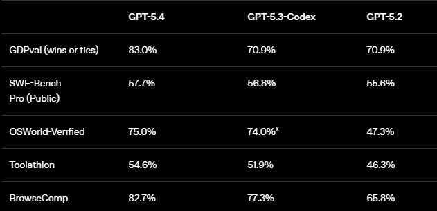 OpenAI shared the following benchmarks comparing 5.4 to 5.3 Codex and GPT 5.2 in their announcement: