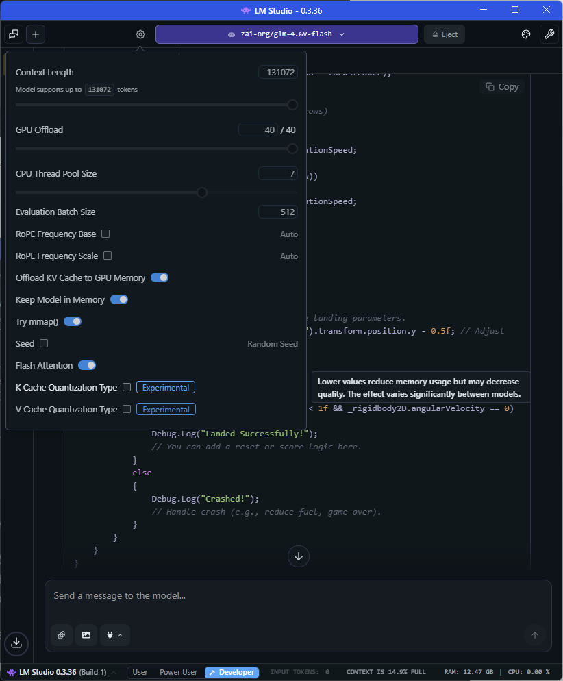 I then reloaded the model with a maximum token context window of 131072 with maximum layers offloaded to the GPU: