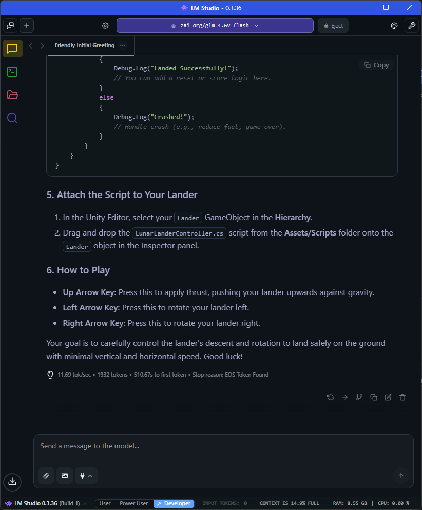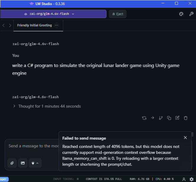 It needs a “minimum” of 8GB VRAM to run so I ran my standard Lunar Lander Simulation coding test using the default 4096 token context window. My initial coding test quickly reached the LM Studio default 4086 context window and errored out with a “Failed to send message” after 1 minute and 44 seconds: